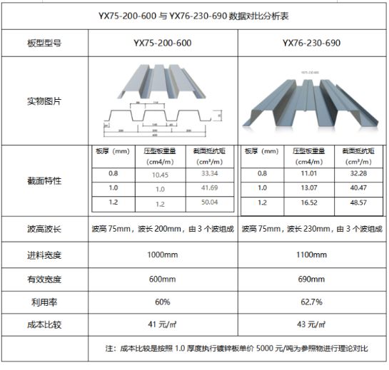 YX75-200-600与YX75-230-690这两种开口楼承板板型进行比较,它们有什么区别呢首先,它们的展开宽度。YX75-200-600开口楼承板的展开宽度是一米,而YX75-230-690的展开宽度是一米一。从用钢的效率上来说,后者的稍微高一点。不过对于楼承板板型来说,决定他本身的是惯性矩和支撑的跨距,最重要的指标是肋高和波距。这两个板型比较,其中肋高是一样的,波距的话是600更加密一点,所以它适合项目的支撑跨距更加大,结构上更加安全。