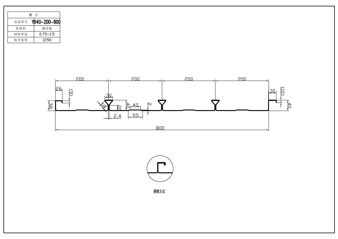 YX40-200-800闭口楼承板,也叫压型钢板、钢承板、钢楼承板,是采用镀锌钢板经辊压冷弯成型,其截面成V型、U型、梯形或类似这几种形状的波形,主要用作性模板,也可被选为其他用途。